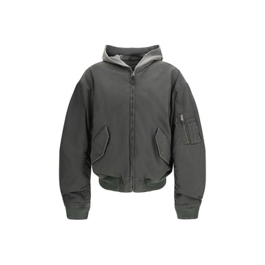 The Standard Bomber Jacket with hood by Balenciaga is made from durable polyamide and cotton canvas, ideal for an urban and functional look. The fleece hood offers extra comfort, while the zip closure and two front pockets with snap buttons ensure practicality and security. The bomber pocket on the left sleeve and ribbed trim complete the design, adding a touch of style. A versatile and contemporary garment, perfect for cooler days.