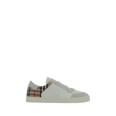 Calfskin Stevie Sneakers by Burberry, featuring a panelled design, a lace-up fastening, a round toe, suede detailing, and the brand’s iconic Check Archive pattern on the back.