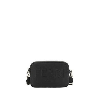 Camera Shoulder Bag by Fendi, top zipper closure, removable and adjustable flat nylon shoulder strap, iconic embossed Fendi Roma logo on front, garnet design, slit pocket on back, single interior compartment.
