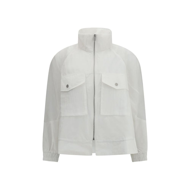 The Beth Jacket with transparent inserts by Pinko is an innovative garment, made from technical fabric reminiscent of taffeta, with transparent ripstop inserts on the sleeves, collar, and pockets, for a perfect blend of durability and lightness. The stand-up collar offers greater protection, while the raglan sleeves and elasticated cuffs ensure comfort and freedom of movement. The practical front bellows pockets with flap and button add functionality, while the zip closure and adjustable internal drawstring at the bottom allow you to customize the fit.